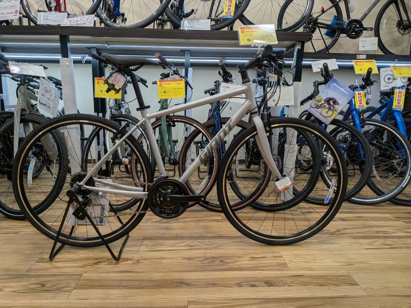 ひと昔前はクロスバイク=700×28Cタイヤ(ロードは700×23Cもしくは700×25C)がポピュラーでしたが時代がすすみタイヤの太さが太くなっていっています!700×35Cや38Cなんて太さのタイヤを搭載したクロスバイクも珍しくありません!時代の流れに沿ってGIANTのESCAPE R3も700×28Cではなく32Cとなっていますが極端に太くなっているわけでもありませんね!