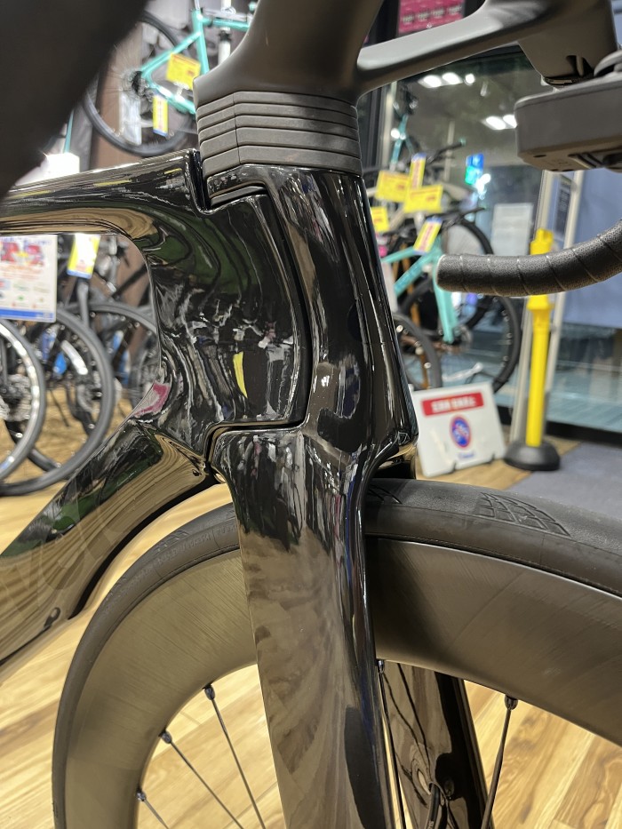 最大の進化点はバイク前方のフロントフォークとヘッドチューブで前モデルよりも深くボリュームのある形状となり、フォークとヘッドチューブの進化で空力性能が前モデル比6.3ワット削減!124gの軽量化も実現しながら剛性と安定性は健在です!