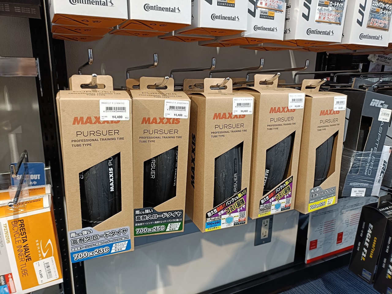 MAXXIS PURSUERは「毎日乗れる・長く使える・よく走る」を高い次元で両立したトレーニングタイヤです。23Cから32Cまで5サイズを在庫しておりますので、ご自身のホイールや用途に合わせてお選びいただけます。