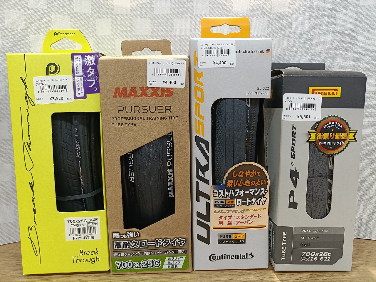 | PIRELLI P4 SPORT | 700×26C | 315g | ¥5,601 | 耐パンク・デイリーユース |