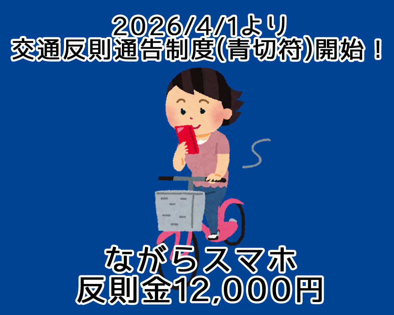 2026年4月1日施行の改正道路交通法により、自転車の交通違反に「青切符(交通反則通告制度)」が適用されます。ながらスマホの反則金は危険が生じなかった場合でも12,000円、危険を生じさせた場合はさらに高額になります。