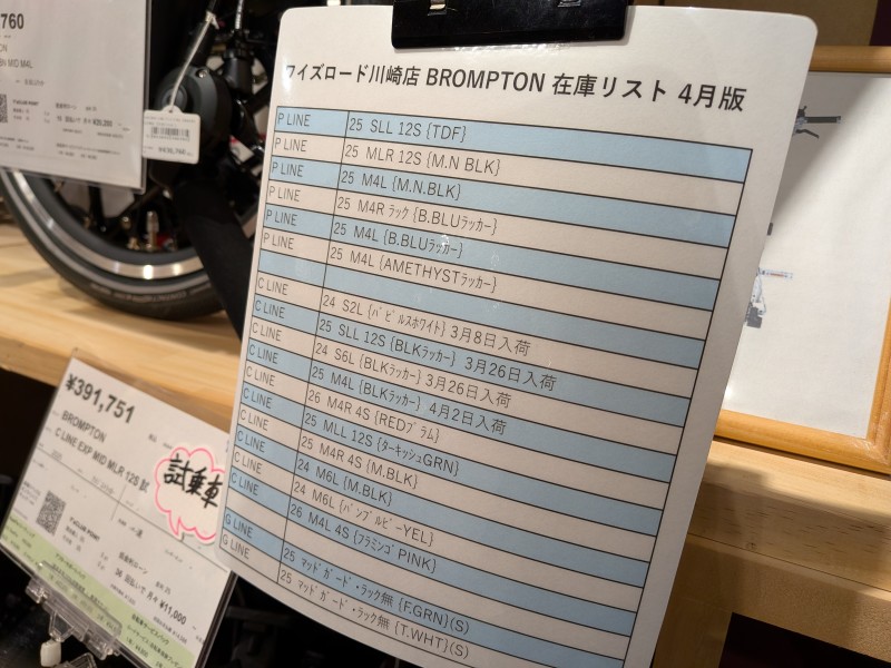 現在ワイズロード川崎店には沢山のBROMPTONがございます!ブラックラッカーに限らずブロンプトンをご検討中の方は是非ワイズロード川崎店へお越しくださいませ!