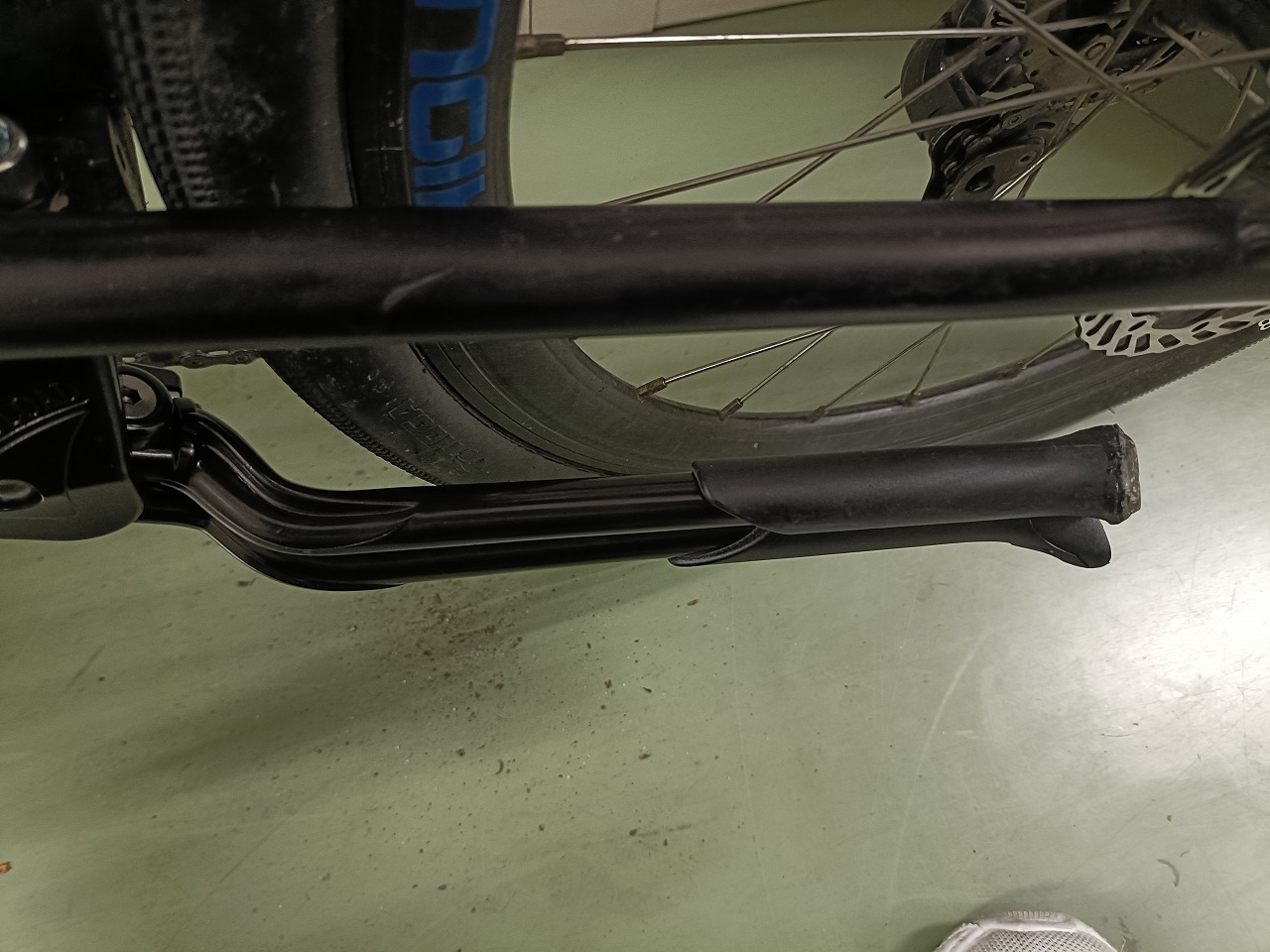 「閉じにくい」とは別の話になりますが、スタンド先端の石突(接地部)が摩耗すると駐輪時の安定性が落ちます。足が削れると脚の接地角度が狂い、しっかり立てたつもりでも自転車が傾いて倒れやすくなります。石突の摩耗は見た目で確認しやすいので、定期的にチェックしてみてください。