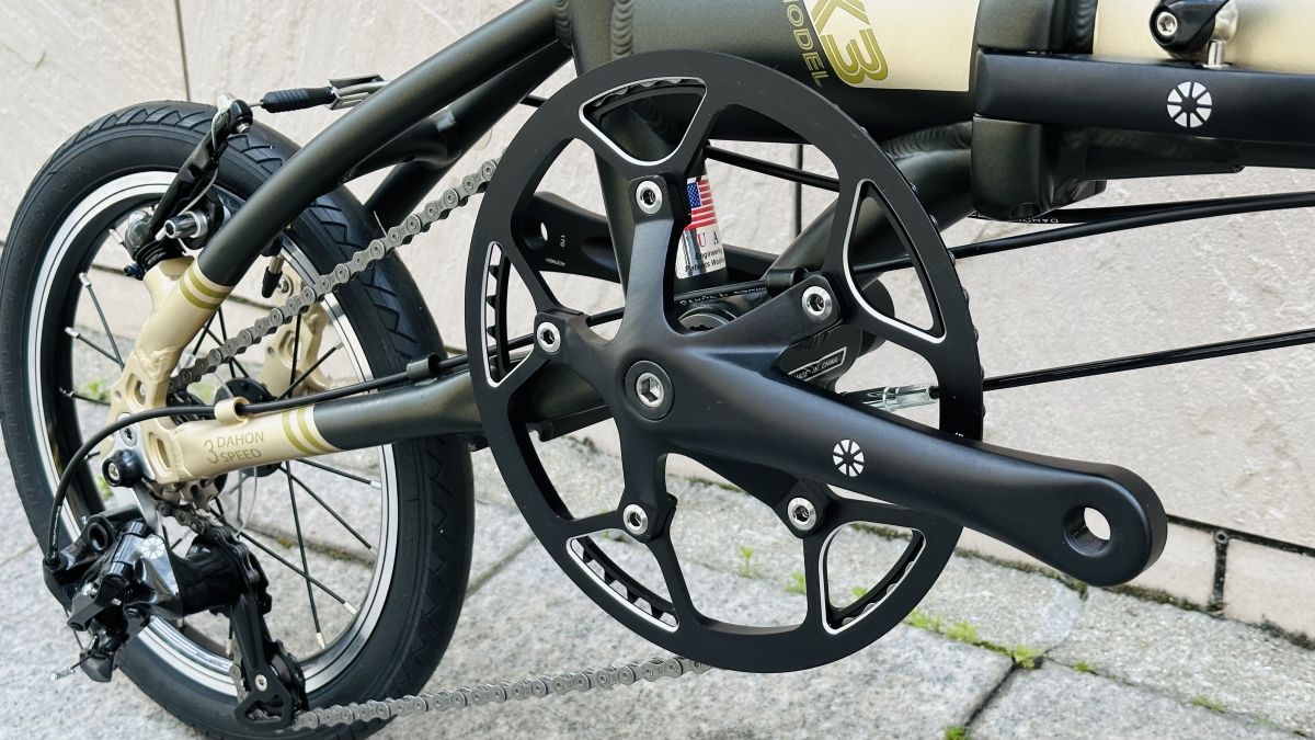 14インチのホイールなので長距離のライドなどには向きませんが、最大ギア比がフロント53T・リア9Tとこれまたロードバイクもびっくりのギア比で平坦路も軽快に乗りこなせます。