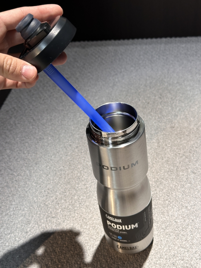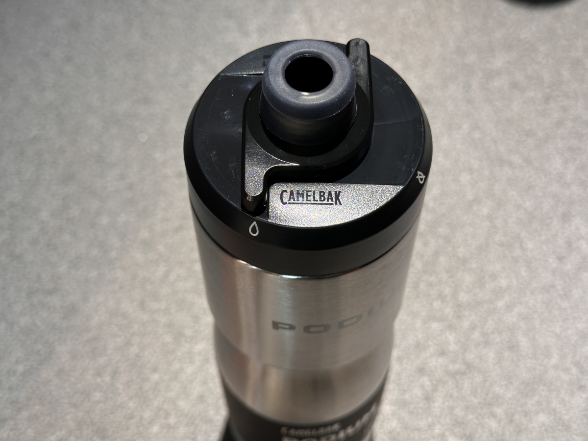 ステンレスボディのためボトルを潰しての飲み方はできませんが、エアロフローチューブと呼ばれる(上記画像内の青いチュー)から流入する空気が後ろから水を押し出すことによって、ボトルを傾けるだけで飲める仕組みになっています。