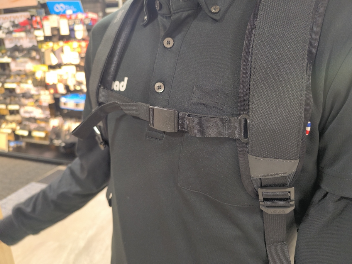 胸のところには位置調整が可能な胸のところにあるやつ(チェストベルトって名称みたいです。)がついていますのでいっぱい荷物を入れても広がることがないのがいいですね。*写真は下限いっぱいです。