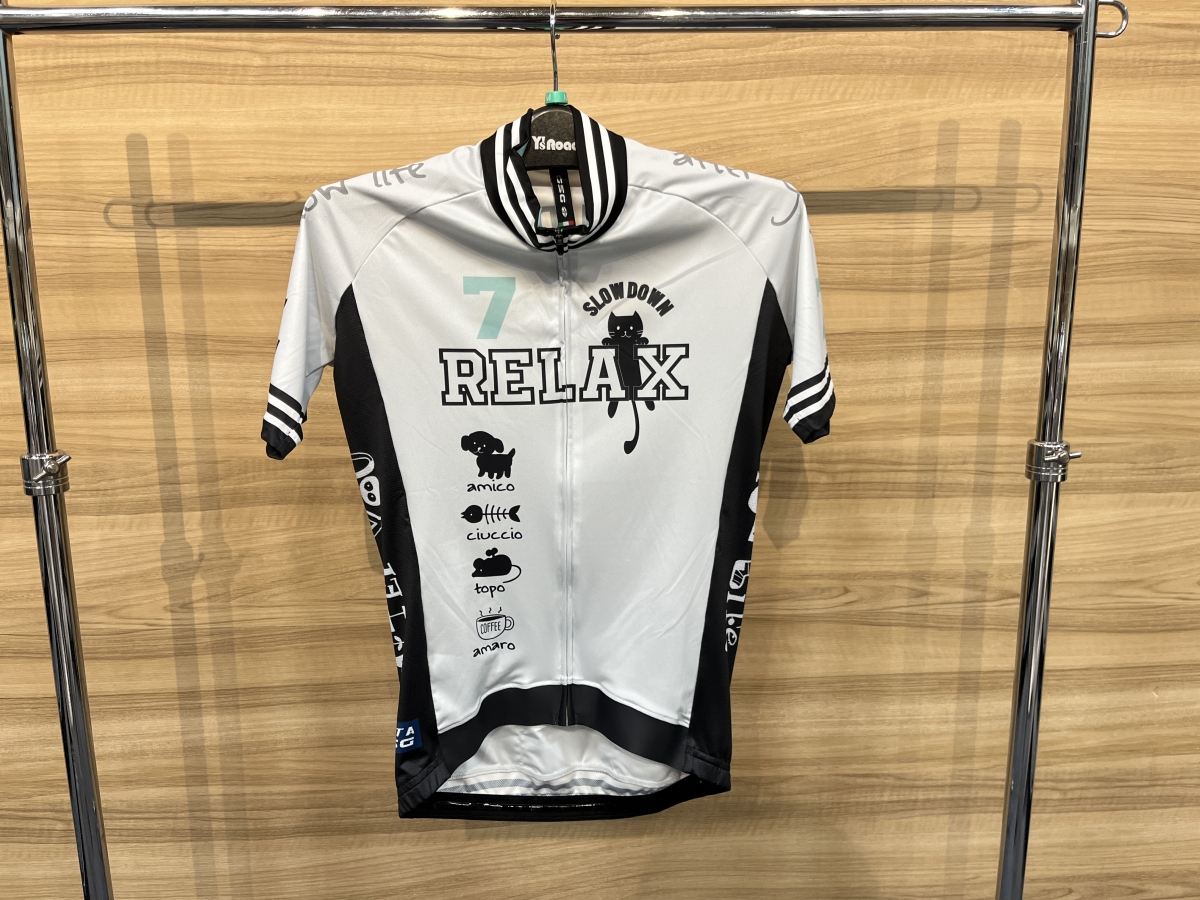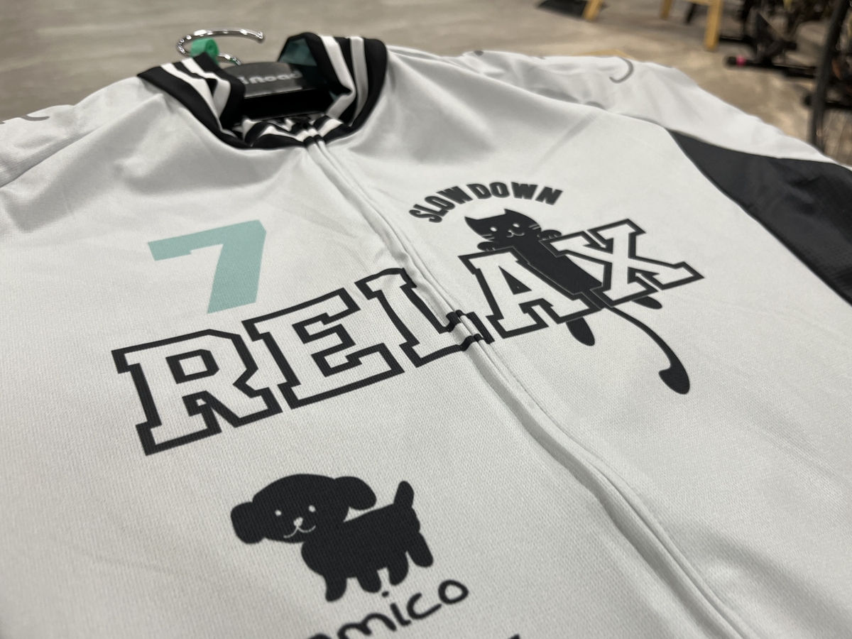ロゴの後ろからぶら下がるネコと寝ているネコがメインモチーフの、コミカルでポップなデザインが特徴のサイクルジャージ。