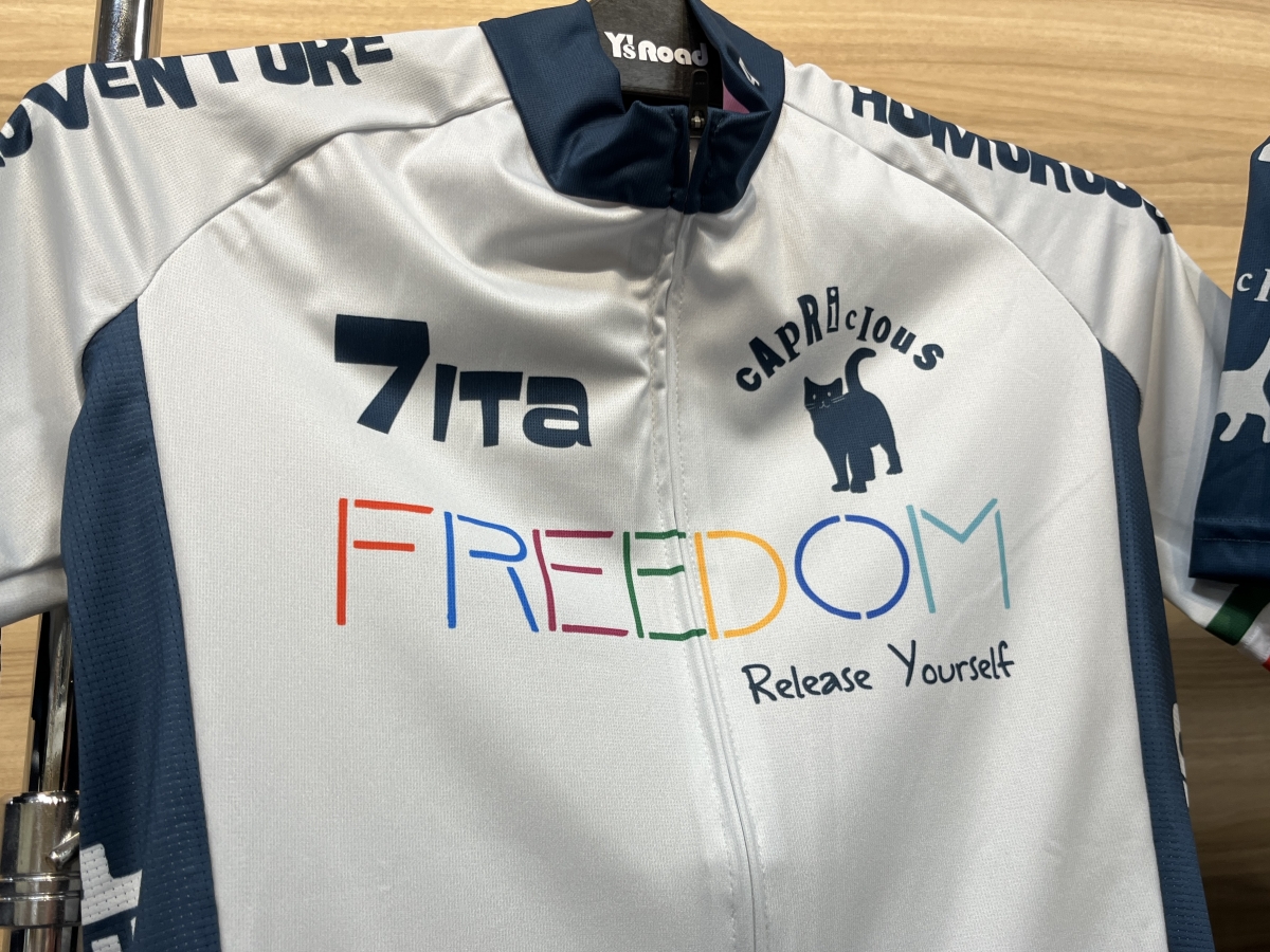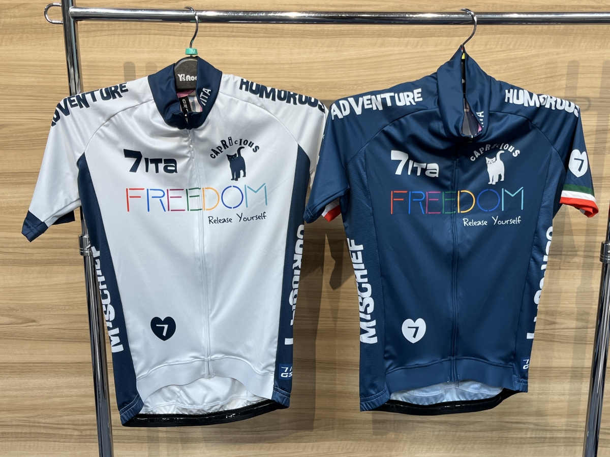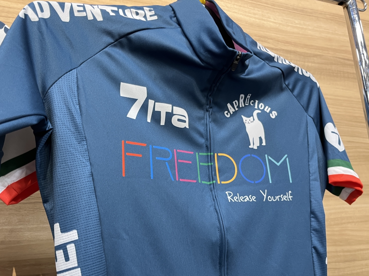 7ITAコレクションで繰り返しモチーフとされてきた7ITAを象徴する言葉「Freedom」と自由なネコ達のデザインを組み合わせたサイクルジャージ。