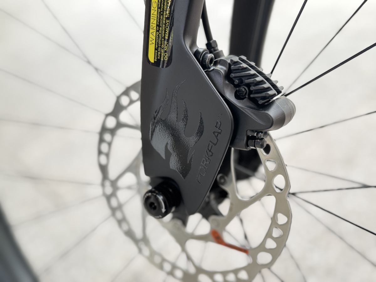 フォークには特徴的なフラップが設けられ気流を整えると共にブレーキキャリパーの保護をします。