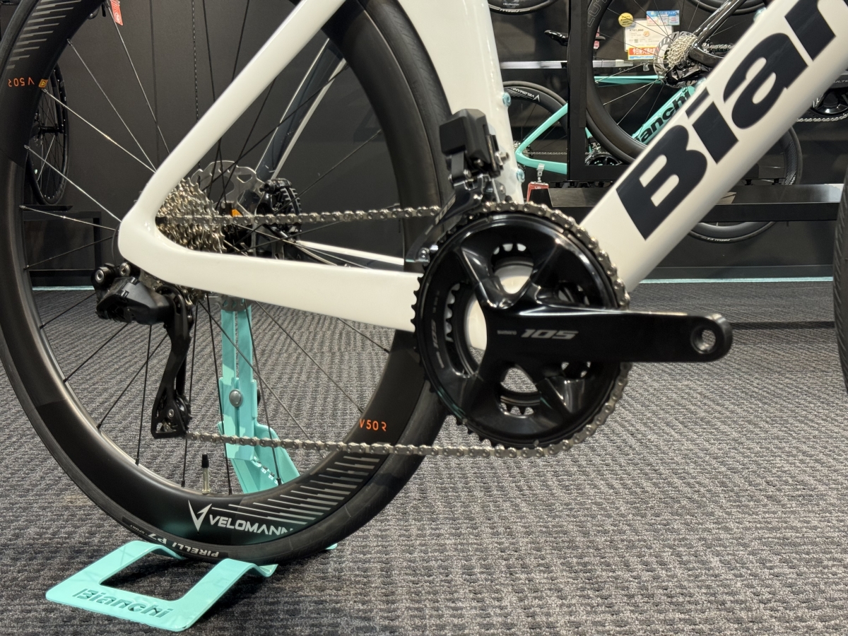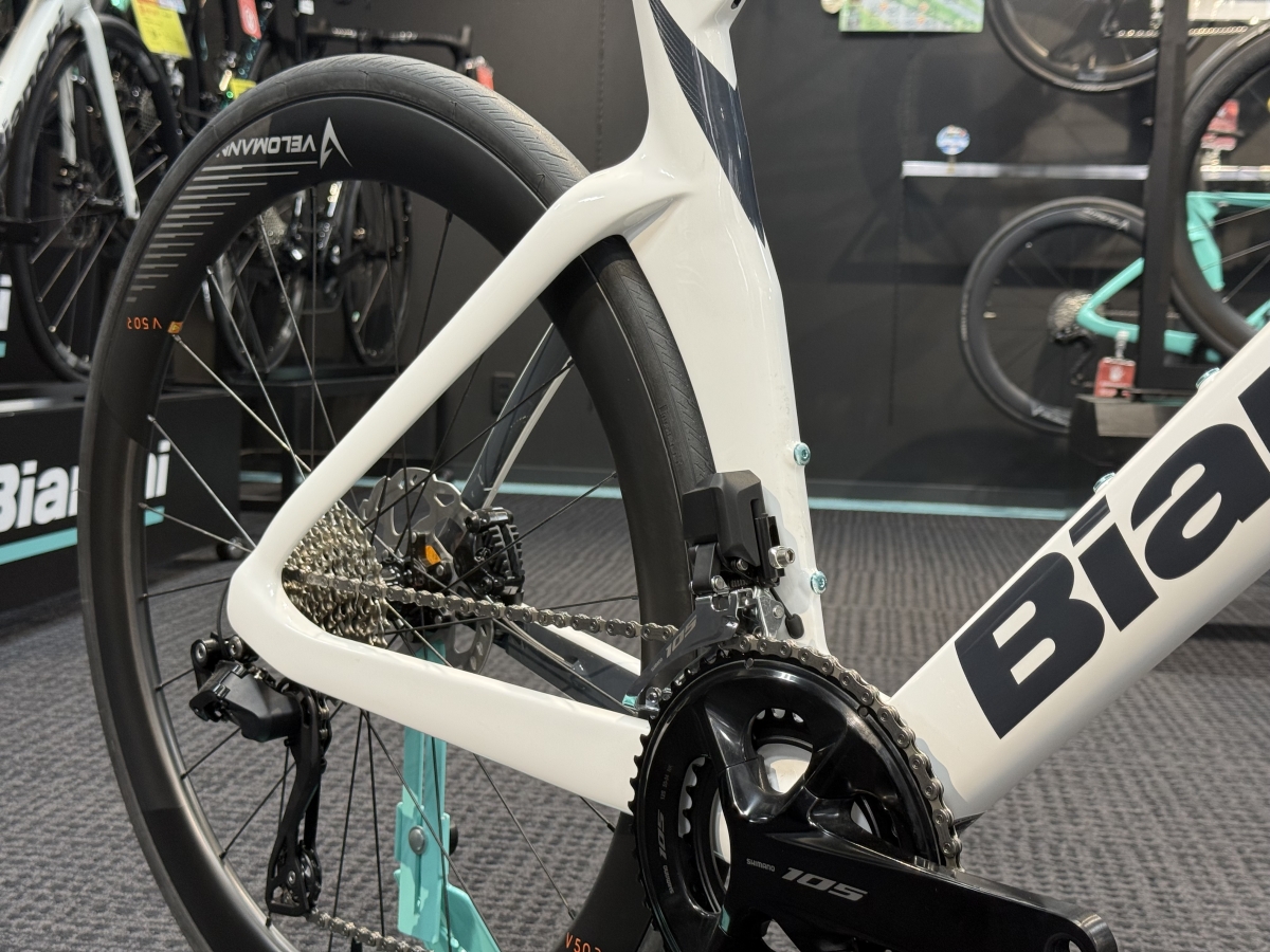 最新の12速105コンポーネントが搭載しています。Di2という電動コンポーネントで変速操作はレバーのスイッチで行えます。長距離ライドでも疲れにくくなりますね。