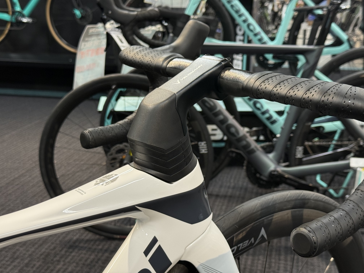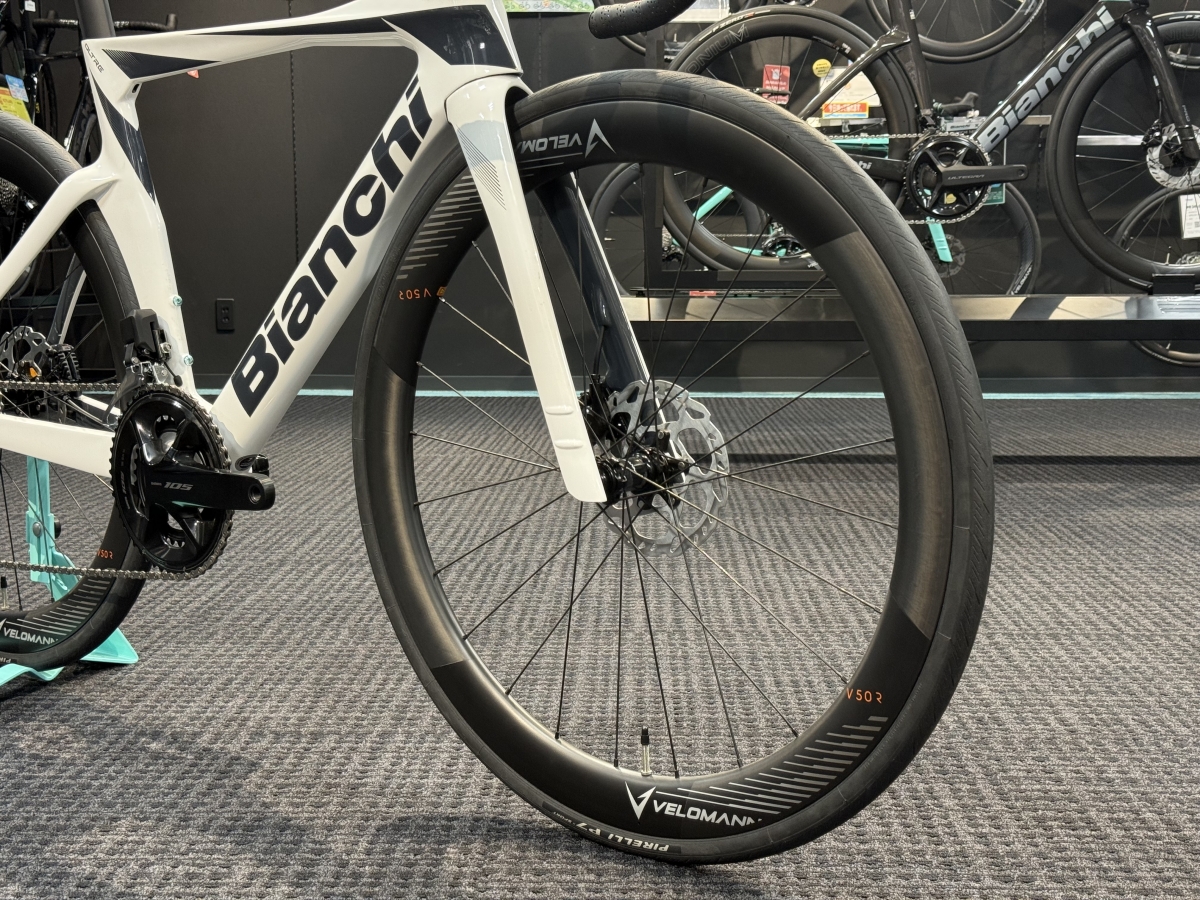最近のBIANCHIの車体に多くインストールされています。このモデルにはカーボンホイール、ステム、ホイールがVELOMANNのコンポーネントが搭載しています。
