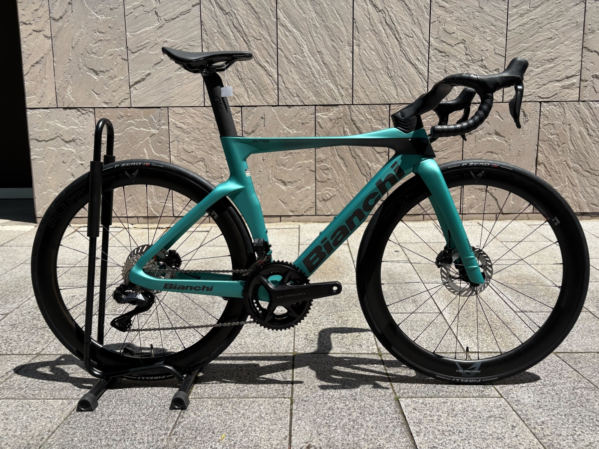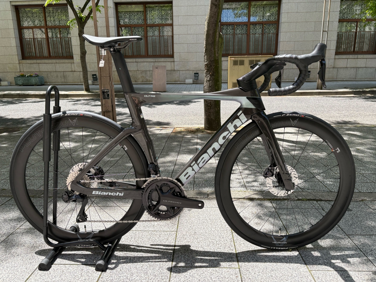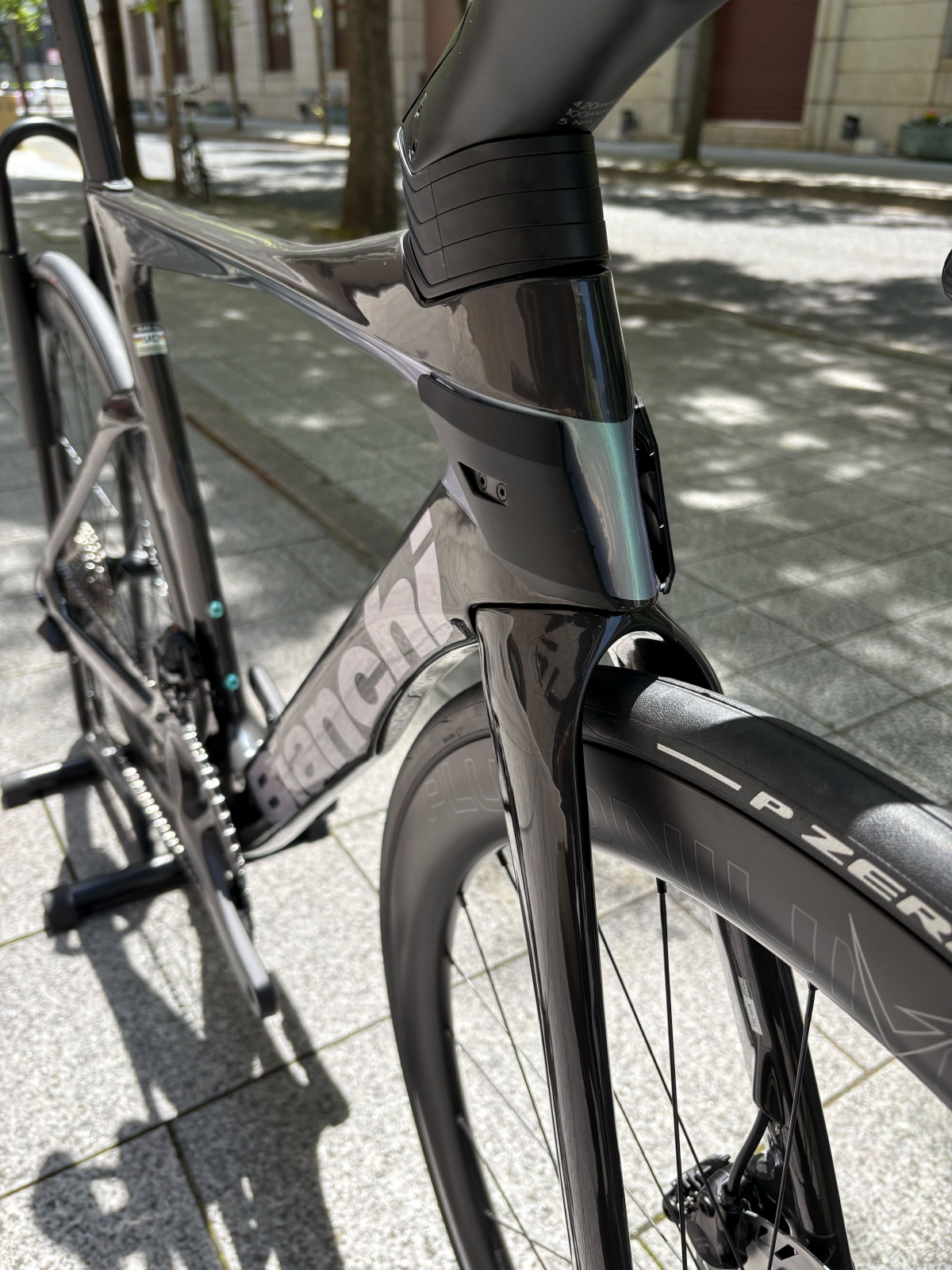 BIANCHIのエアロモデル『OLTRE』シリーズ。このPROについては、上位機種と形状は全く同じでエアディフレクターやエアロハンドルバーもRCと同様のものが搭載されています。違いとしては、CV(カウンターヴェイル)と呼ばれる振動除去機構がカーボンに搭載されています。