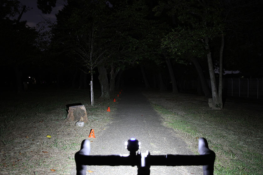 写真上がロー(300Lm)最小約200Lmから下がハイ(1300Lm)最大約1300Lmの光量です。ナイトライドなど、街灯の無い道でも安心してご使用いただけます。
