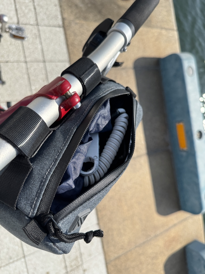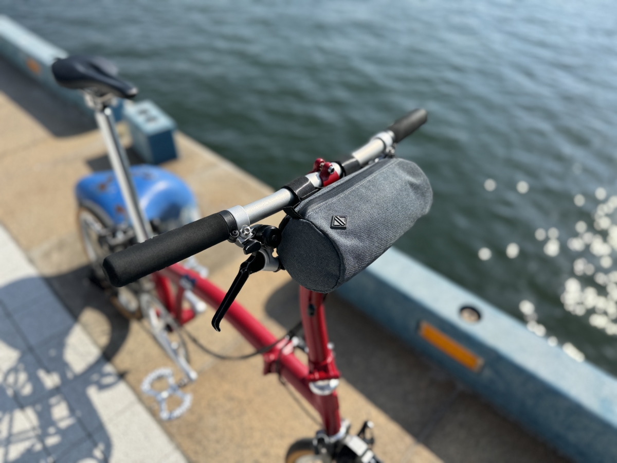 しかし何も車載出来ないのはちょっと不便。。。という事で小さいハンドルバーバッグを付けています。