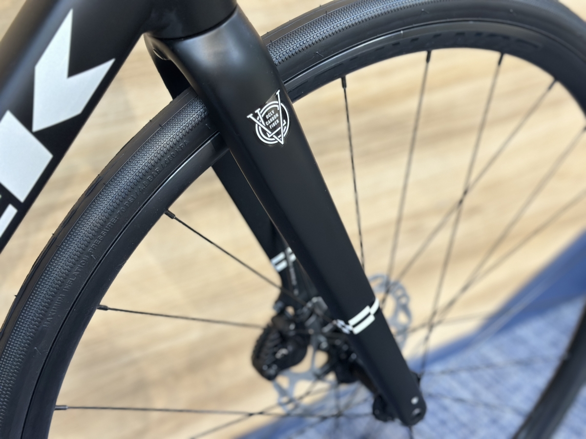 カーボンフォークのメリットとしては、①車体重量を軽くすることができる。②カーボンの特性を生かし、路面からの細かな振動を吸収できる。この2点があげられます。