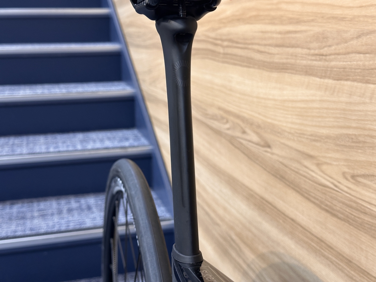 非常に薄いシートポストになっており、前面からの風をしっかりと後ろに流してくれるエアロ効果抜群の仕様に。
