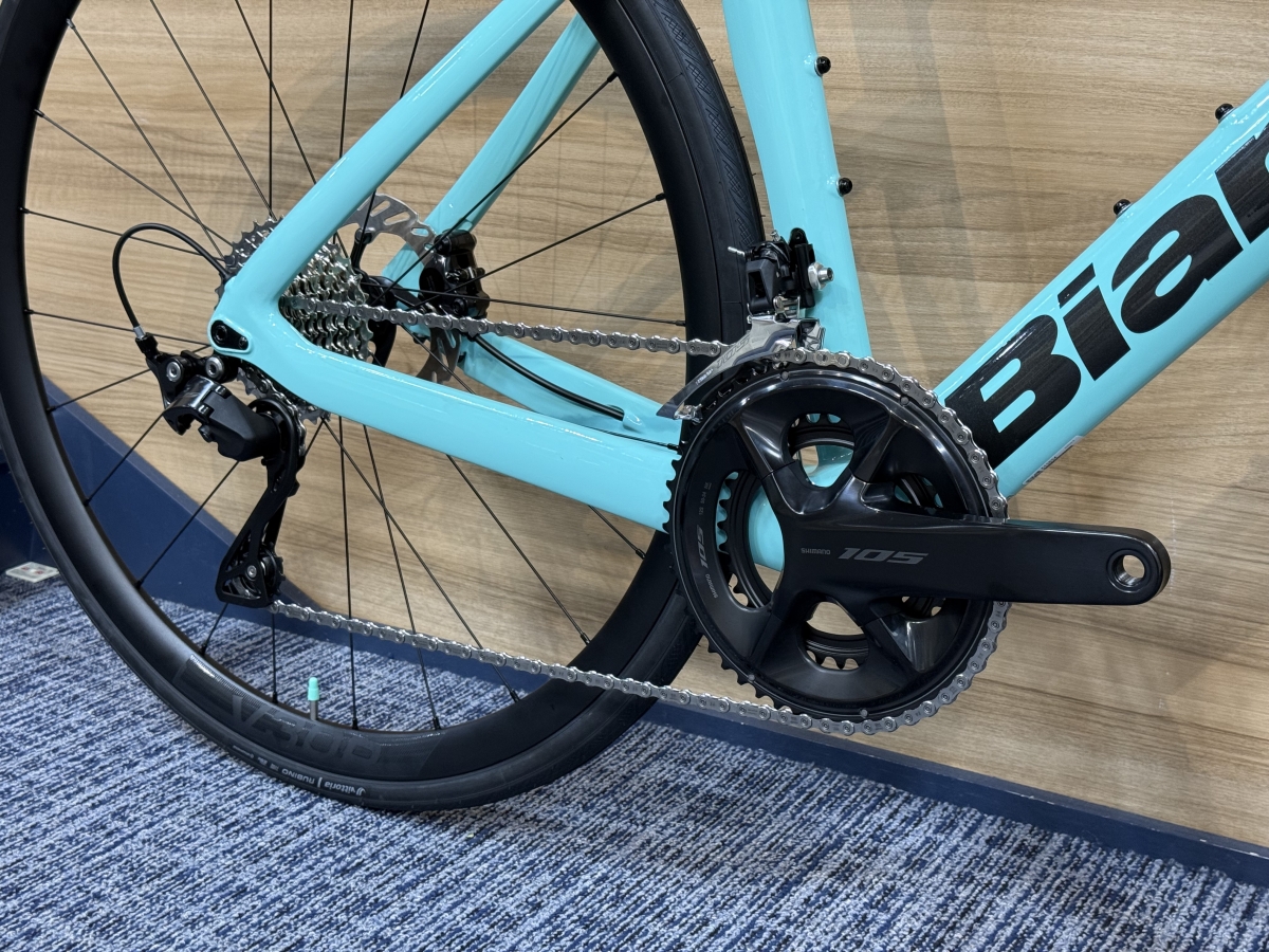シマノ105 12速をインストールしています。今後の電動コンポへのアップグレードもカスタムの幅があり楽しめるポイントです。