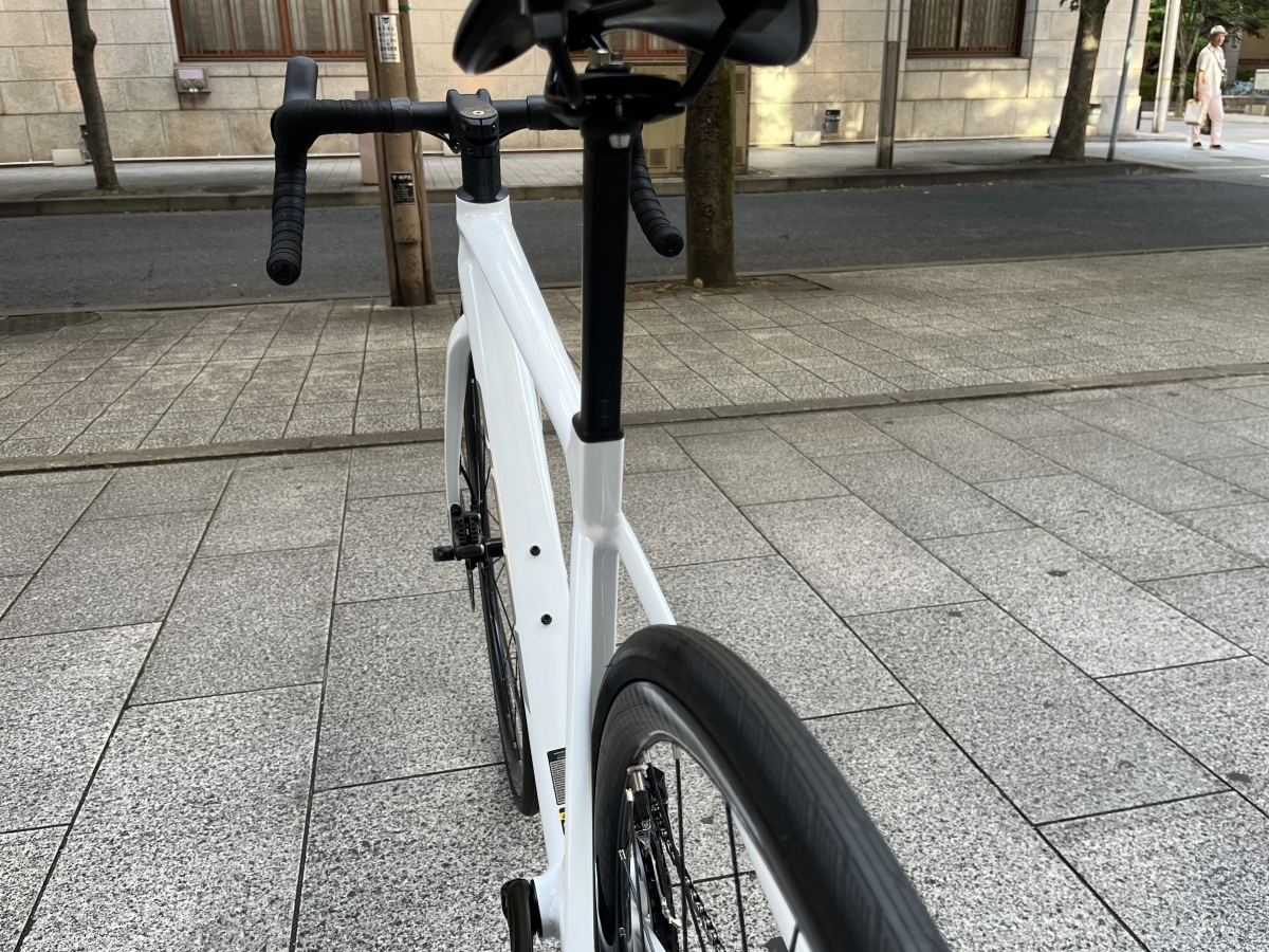 写真を見てわかる通り、シートチューブやシートポストは非常に細く作られています。カーボンバイクではよく見られる形ですが、アルミフレームでは比較的珍しい形状です。