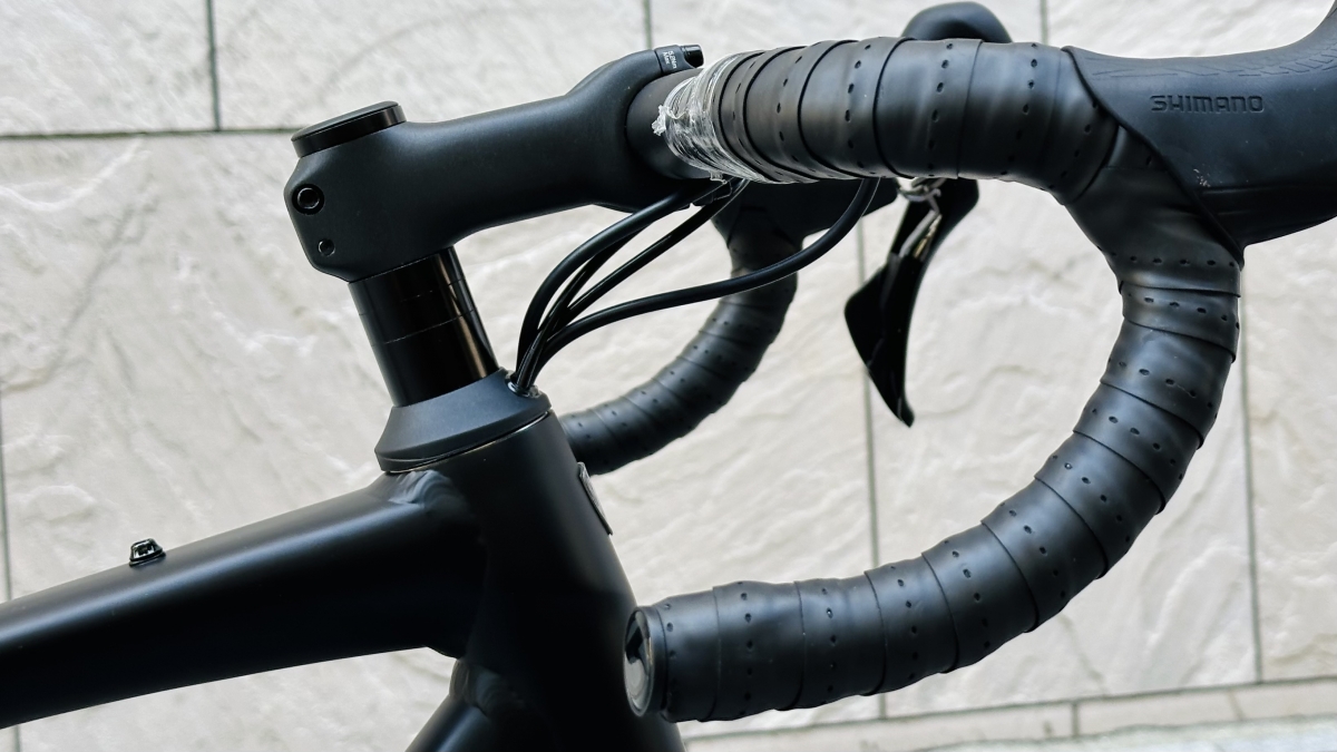 こちらのモデル、メーカーのラインナップ上はエントリーグレードという位置付けですがブレーキホースなどのケーブル類はステムの下を這ってフレーム内部に入る構造となっており非常にスマートな外観となっています。