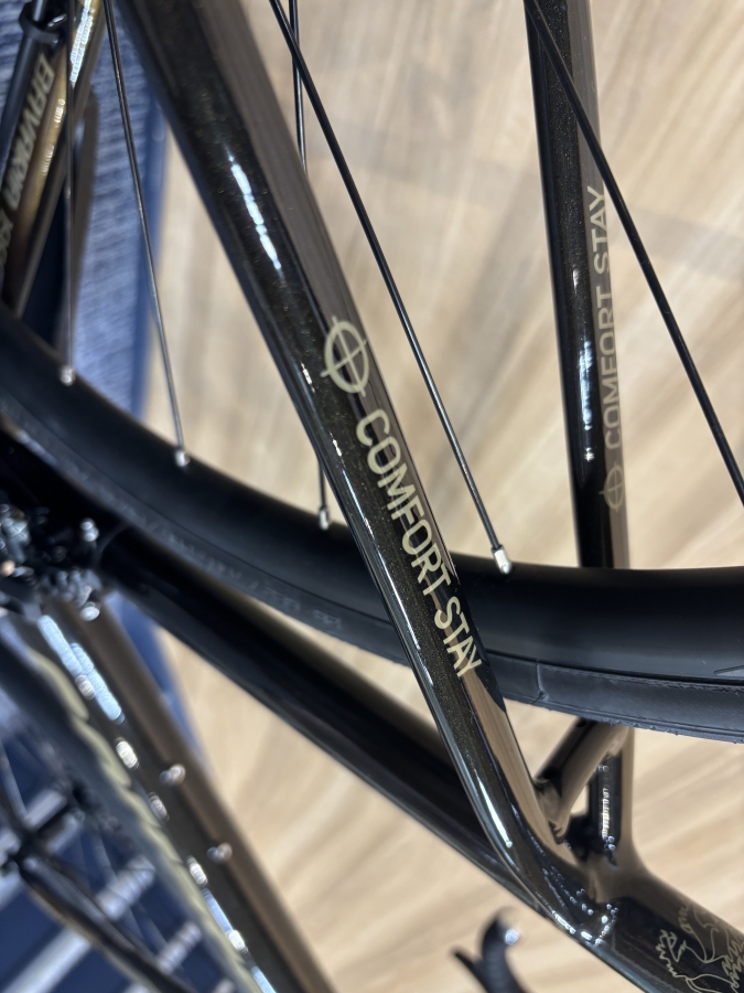 シートステーは潰しのかかった形状で、乗り心地の良いCOMFORT STAY。これにより、アルミフレームらしい乗り心地の硬さを軽減します。