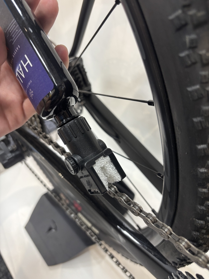 チェーンルーバーとは何ぞや。私も最初はそう思っていました。しかし実際に商品を見てみると中央の溝の部分にチェーンを挟んで注油ができちゃうんですね。交換用も入っていて超便利。