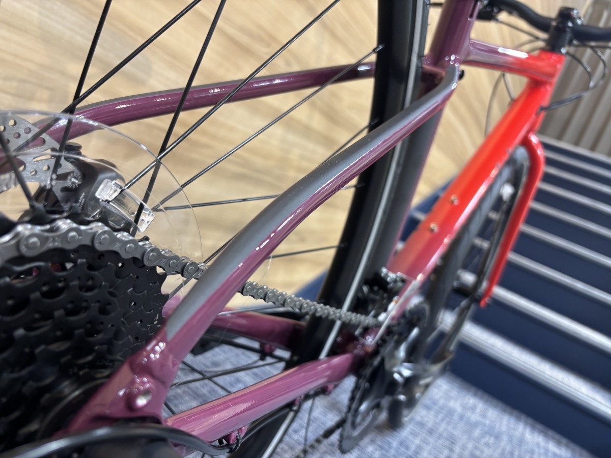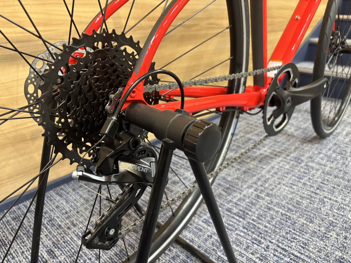 フロントシングル(フロントの変速がないタイプ)でチェーントラブルが少なく、操作も簡単です。その分ギアの構成はワイドで、急な登りにもしっかり対応できます。