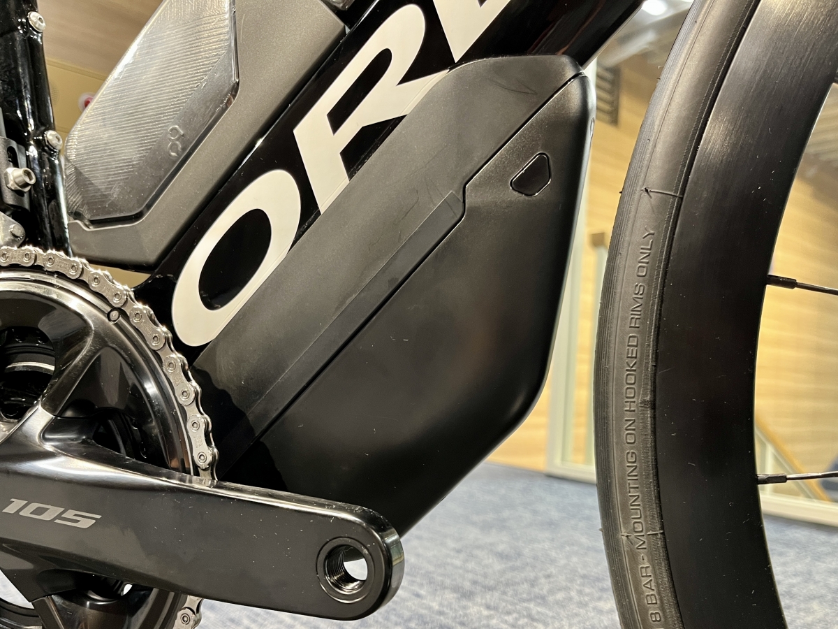 ORBEAのロードバイクはモデル名で系統が、そのあとに付く数字や記号などでグレードがわかるようになっています。この車体の場合、エアロ系、105コンポ、オルベアの最上級カーボンが採用されていることを表しています。