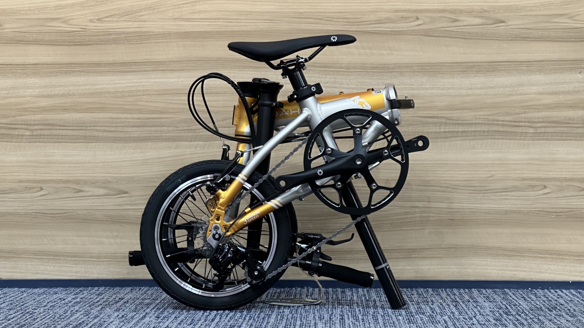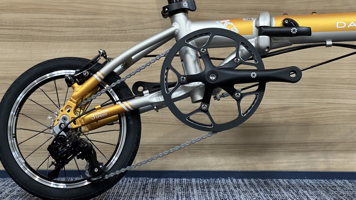14インチのホイールなので長距離のライドなどには向きませんが、最大ギア比がフロント53T・リア9Tとこれまたロードバイクもびっくりのギア比で平坦路も軽快に乗りこなせます。
