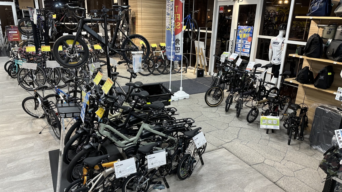 店頭では多様な折り畳み自転車を取り扱っております。皆様のご来店をお待ちしております。
