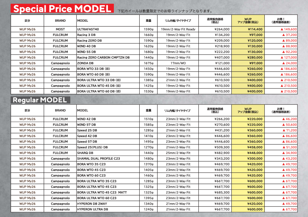 2026年プログラムでは新たに最新のホイールも仲間入りし、最新のスペックがお求めやすい価格となりました。