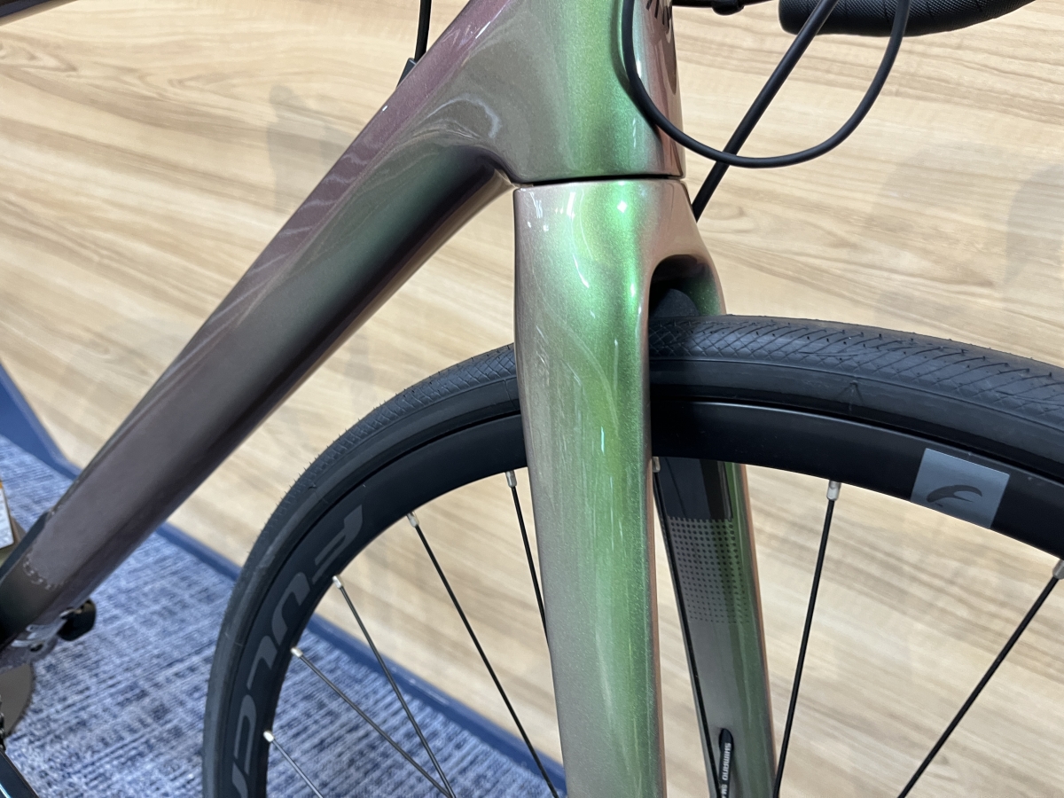 エアロシェイプデザインをフレーム&フォークに採用しており空気抵抗が小さくなるよう設計されています。さらに、サイズごとにカーボンレイアップを調整し、全てのボディサイズに妥協することなくベストな同じ乗り味を提供できるようになっています。