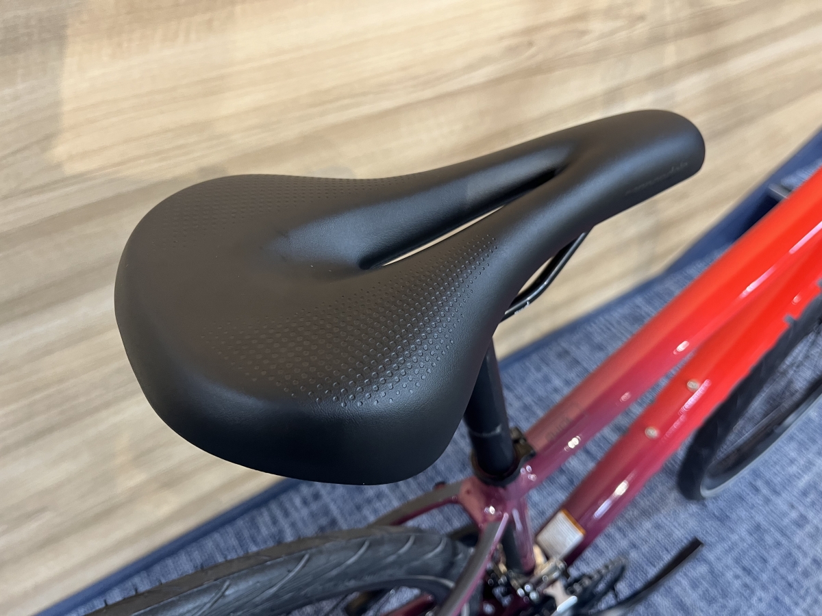 こういったクロスバイクのようなスポーツタイプの自転車ですとカチカチのサドルが付いてることが多いのですが、このモデルは街乗り仕様ということで柔らかいサドルが付いています。