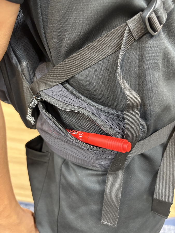 こちらはバックの側面にある、ケータイやジェルなどを入れる場所になります。その他にも鍵など小物の収納はこの小口で賄えますね。