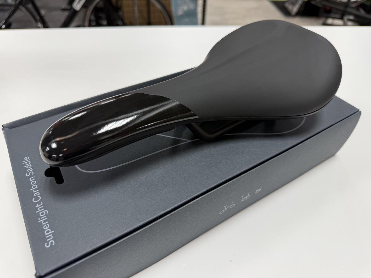 カーボンレールで純正サドルよりも182gも軽くなります。こちらもやはり純正パーツ、純正リアライト取付穴もあり、サドル前面には持ちやすくなるためにラバー素材になっています。