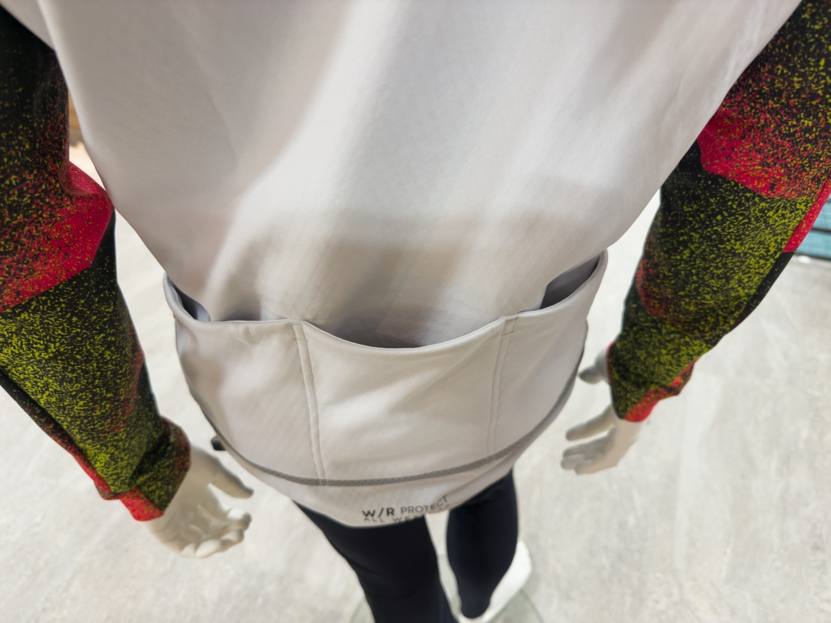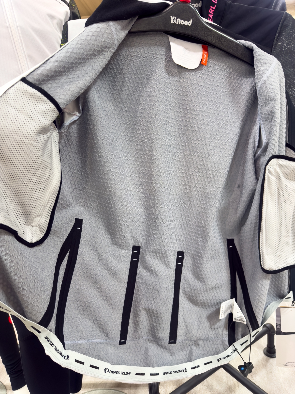 内側ですが裏起毛ではなく少しタオル地に近い触り心地になっており、薄く軽くシンプルにつくられていますね!そしてこちらのウェアは完全防水ではございませんが撥水機能も備えているので多少の水は弾いてくれます。にわか雨の時にも体温を奪われる事なくライドを続けれそうですね。