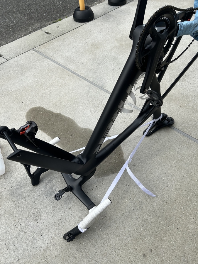 ③ホイールをフレームの横に置いて、ゴムバンドで止めます。この際、フレームとホイールが当たる部分は布をかましておきましょう。