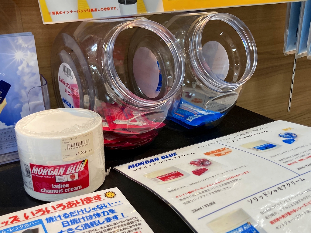 神戸店ではフロア奥のウェアコーナーにて販売しておりますので、お尻や股の肌の痛みが気になる方はチェックしてみてください。