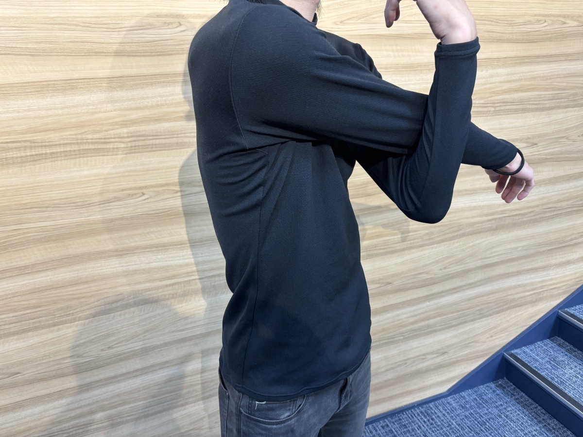 全体のフィット感をロードバイク向けのタイト目にして、後身頃を前身頃より約4cm長く仕上げています。またハイネック仕様により首回りの暖かさを保ち、手首の保温のために袖を長めに設計しています。
