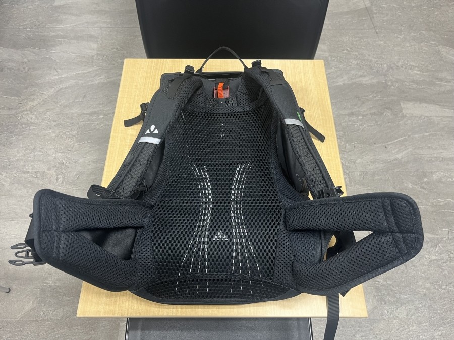 こちらのリュックにはVAUDE独自のAEROFLEX 3D 2.0 サスペンションシステムによって背面とバックが振れないようになっています。そして使用時に熱がこもりやすい背面の通気性を高め、快適性も向上します。またパッド入りのヒップストラップとショルダーストラップ、VAUDE独自開発の背面長調整システムによって、自身の背負い方に最適な調節も簡単です。