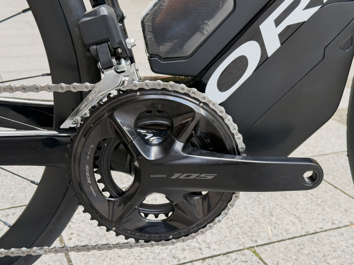 コンポーネントはシマノの12sモデルの105で統一されておりますが、このオルカエアロはDi2を採用しておりますので、電子変速ならではのスムーズな変速をお楽しみいただけます。