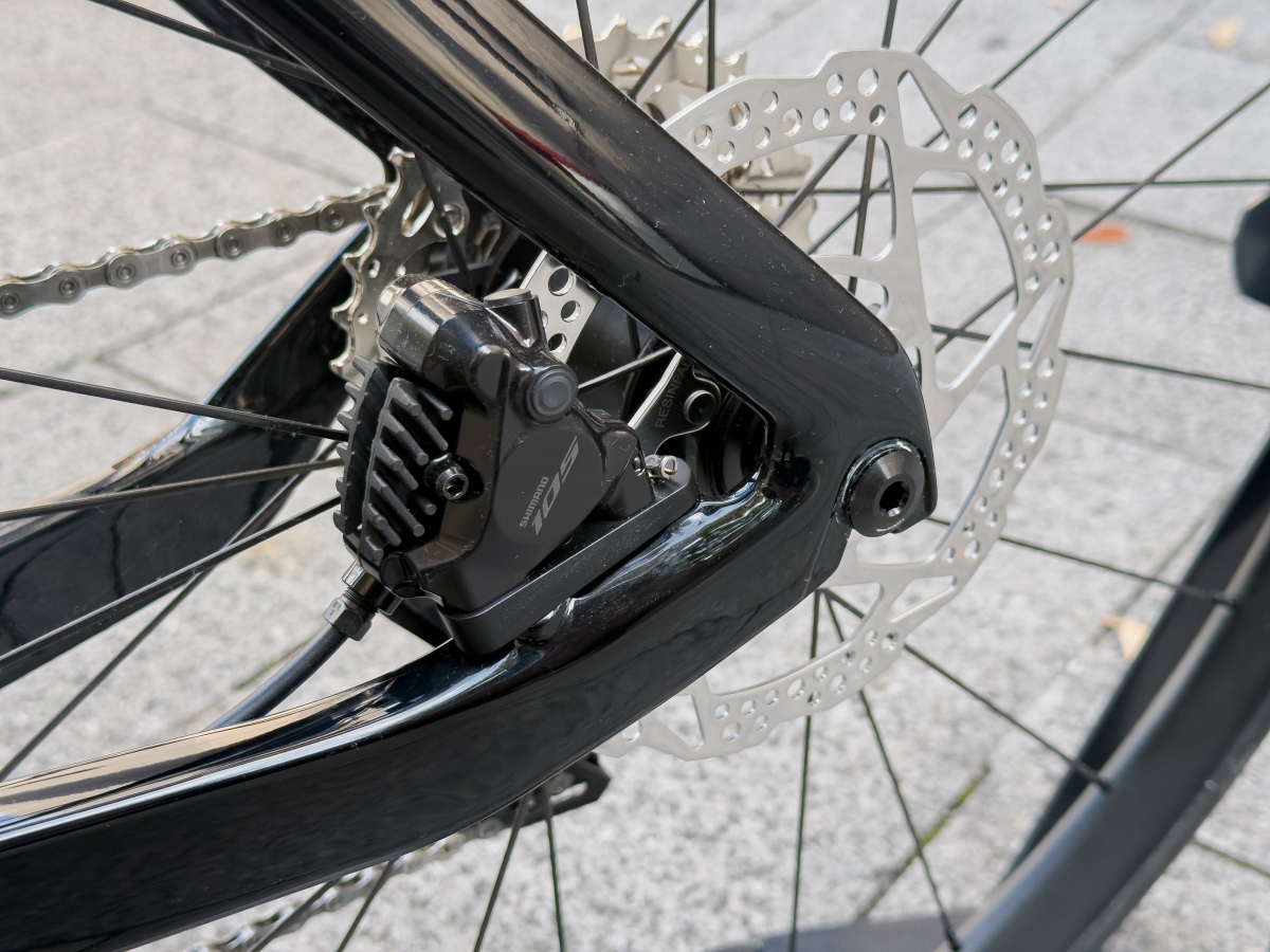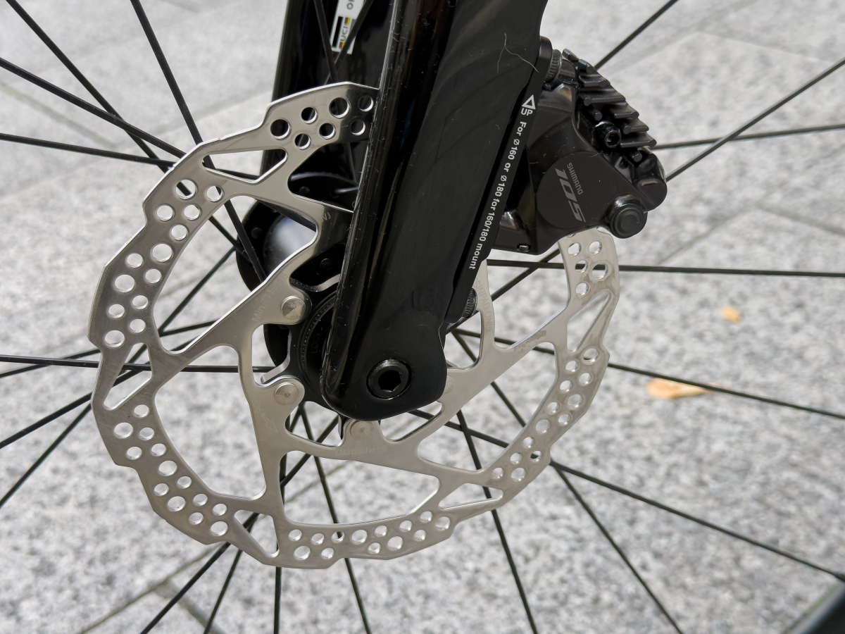 前後共に105のディスクキャリパーを装着、突然のブレーキでもディスクならではの制動力でしっかり止まることが出来ます。油圧ブレーキなのでヒルクライム時の帰りなど長い下り坂を下る時も小さい力でブレーキを掛け続けれますので、握力に自信ない方でもしっかり減速できます。