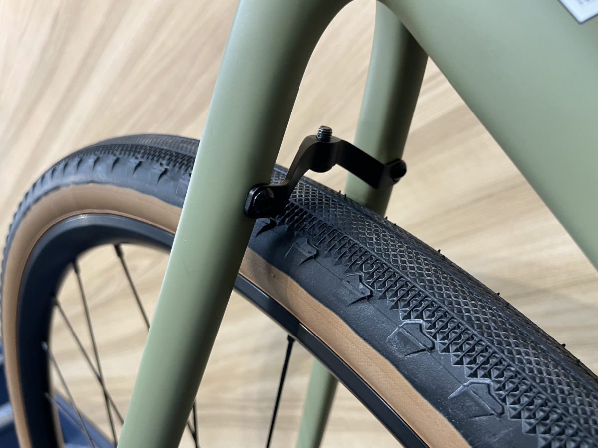 最大タイヤ幅は40cと一般的なグラベルタイヤなら入るサイズを実現しつつ、ロードバイクの様なフロントチェーンリング(52-36t)もつけられるように設計されています。