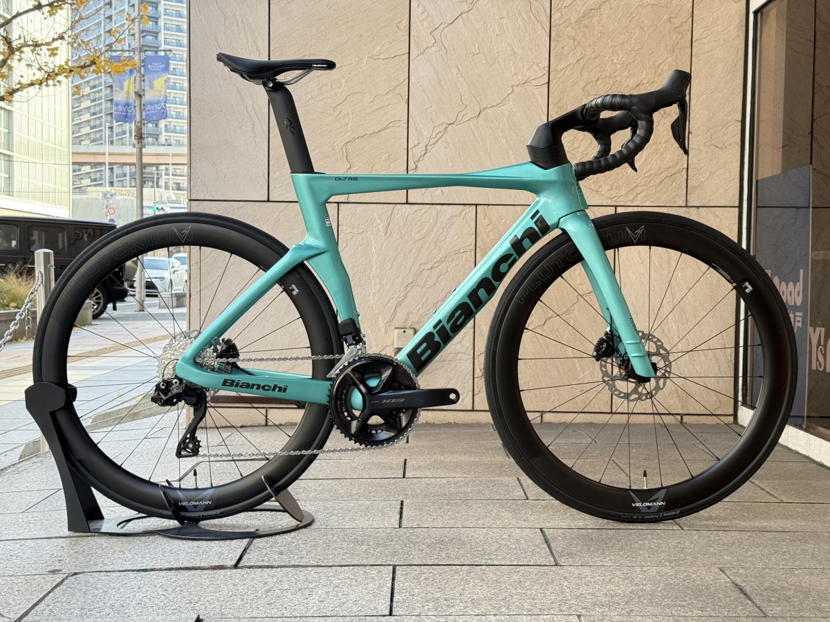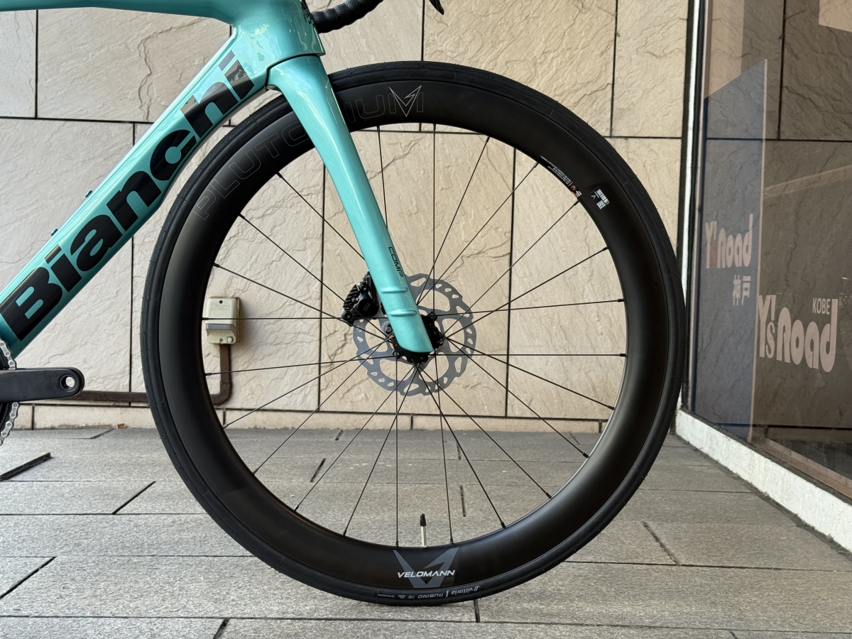 ホイールはVELOMANN PLUTONIUM 50mmがインストールされています。カーボンホイールで1,630gと重量はそれなりに抑えられています。より軽いホイールも多くラインナップございますので、ホイール交換のご相談もお待ちしております。