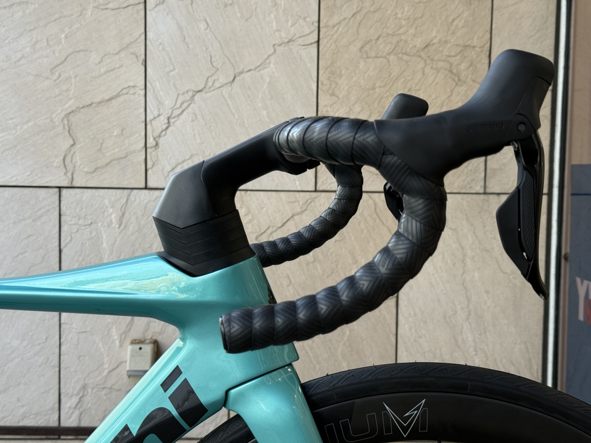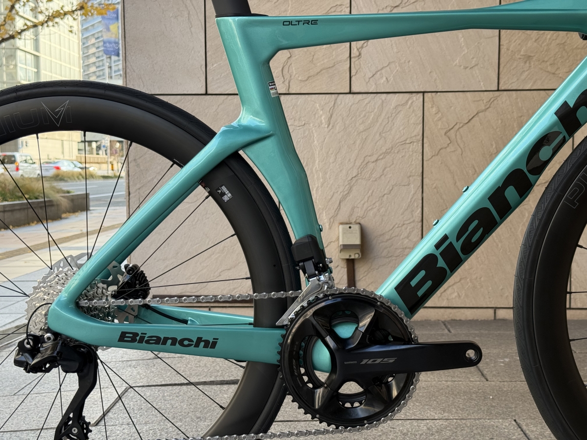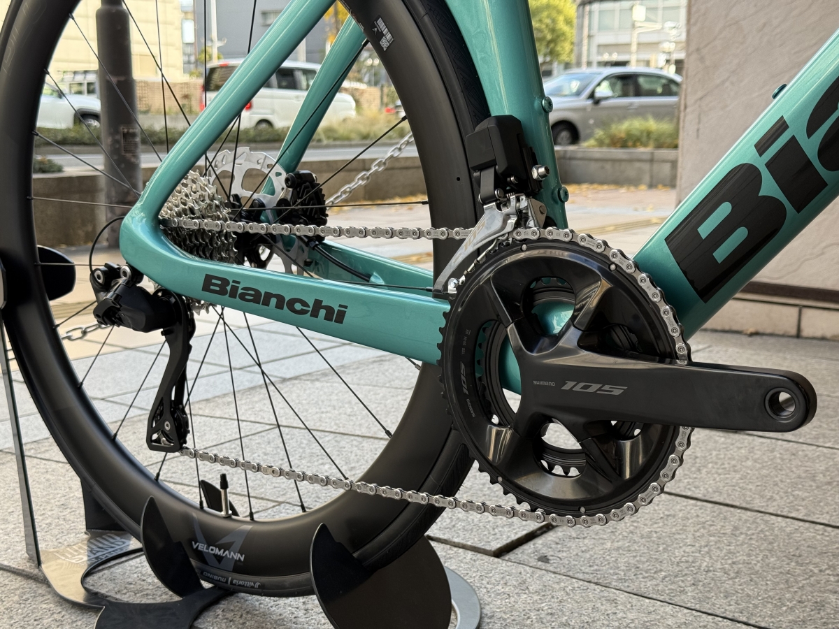 コンポーネントは105Di2で電動コンポが搭載されております。スイッチ操作のためスムーズ且つストレスの少ない変速ができます。
