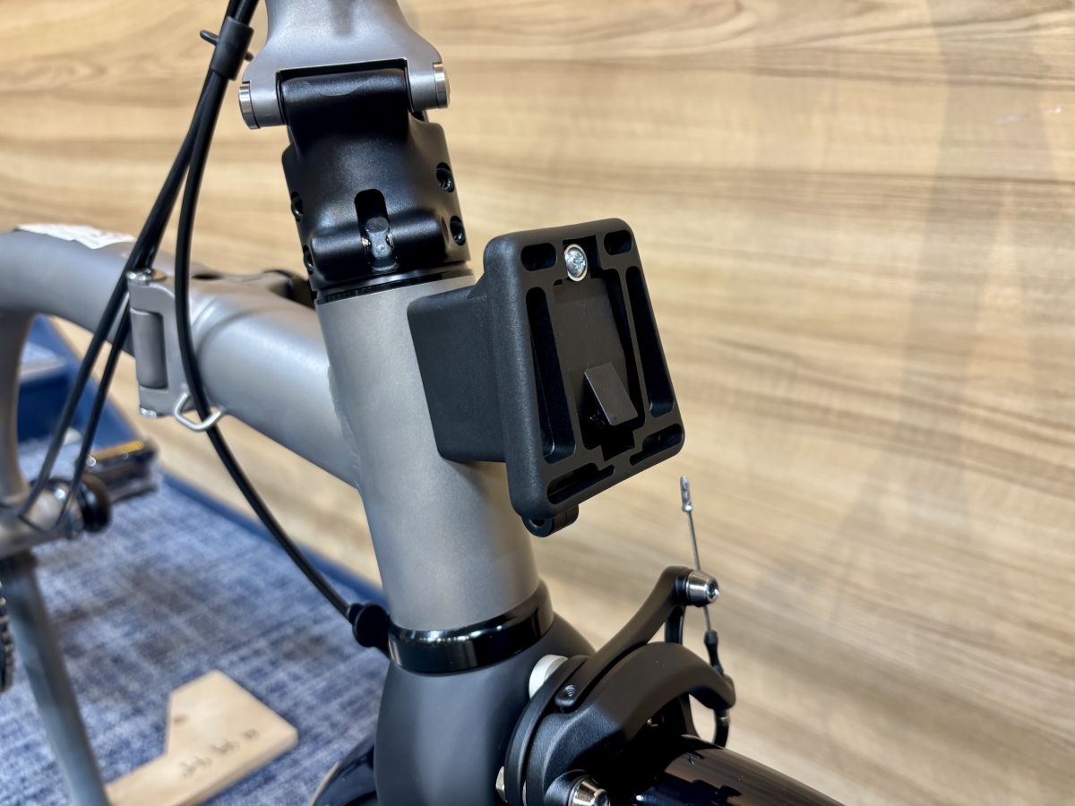 簡単にバッグを取り付けることのできるフロントキャリアブロックもしっかり標準装備しています!様々な種類のあるBROMPTONバッグの中からお好きなものを選んでいただけますよ!