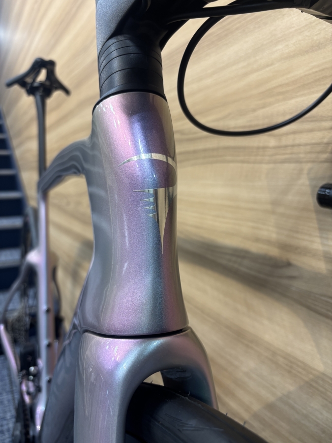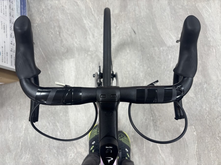 こちらの車体ですが、ハンドル幅がかなり狭めでフレア形状の設定になっています。実測で上が360mm、下が400mmでした。ですので上ハンドルを持つときは狭めのハンドル幅でエアロ効果がありエアロポジションも取りやすく、下ハンドルを持つときは少し広めでダンシング時の安定感が得られます。少し試乗させていただいた時には最初はかなり狭く感じましたが、エアロポジションがかなり取りやすく楽しく乗ることが出来ました!コラム形状が特殊なため、専用品をお選びいただくと一体型ハンドルもインストール可能です。
