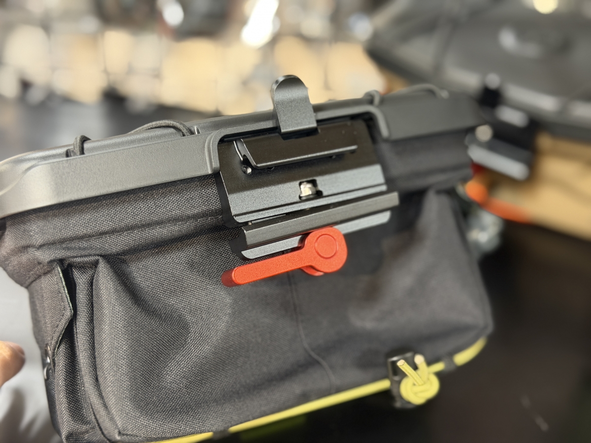 こんな感じで赤いレバーの操作だけで脱着が可能となっているため、ベルクロをハンドルから外さないといけないなど、ややこしい作業を全て楽にできるのでストレスフリーで扱うことができるのではないでしょうか。