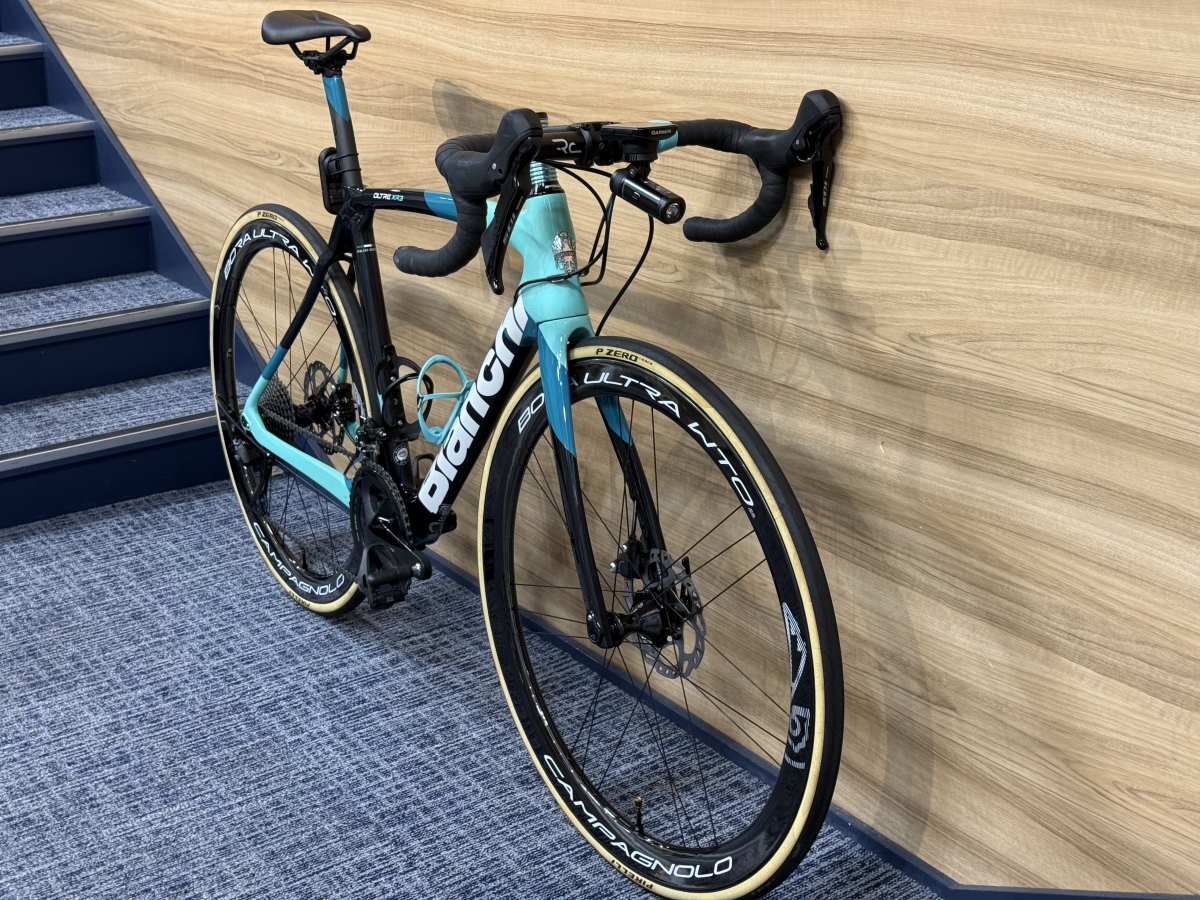 このホイールは数量限定の特別なチームエディションモデルで、カンパニョーロならではのホワイトロゴで本体自体はBORA ULTRA WTOの最新モデル。一番新しくなりリム内幅を23mmへと拡大され、空気抵抗も軽減されています。