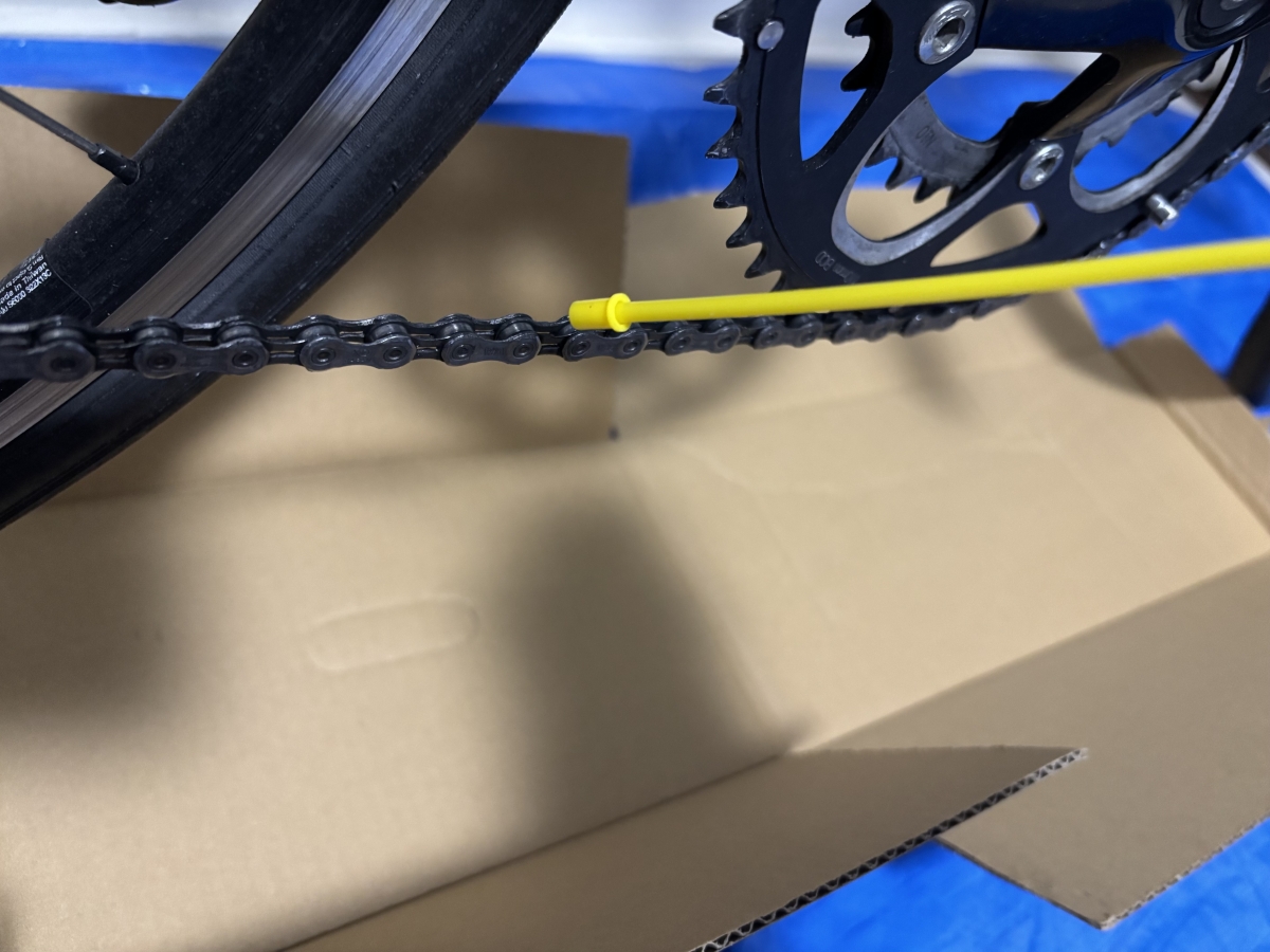 使い方としては、チェーンが外側に来て作業がしやすいのでチェーンをアウター・トップにした後、ウエスを下に当てつつ1周吹きかけてあげます。その後、オイルが飛び散らないスピードで5周ほどクランクを回して全体に馴染ませます。