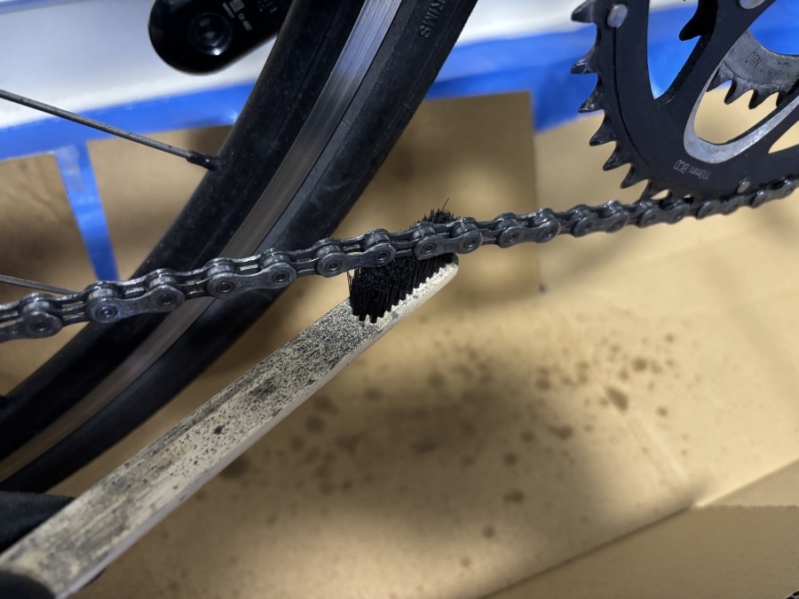 付属のブラシでチェーンのコマを回すように上下からゴシゴシとブラシでこすってあげましょう!少ない液量でもしっかり汚れを分解してくれますので、屋内でも洗車ができて◎